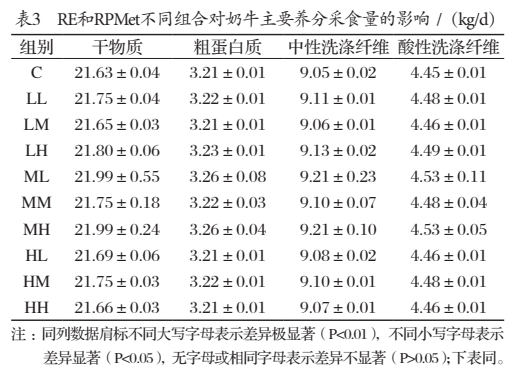 由表3可知,RE和RPMet组合使用对奶牛采食量的影响不显著(P>0.05)。