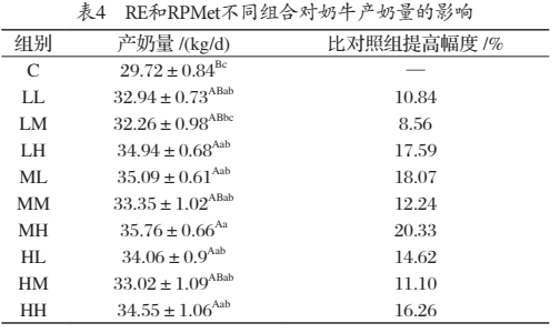 2.2 RE和RPMet不同组合对奶牛产奶量的影响(见表4)