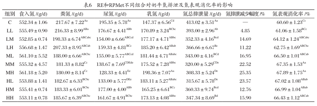 2.4 RE和RPMet不同组合对奶牛氮排泄及氮表观消化率的影响(见表6)