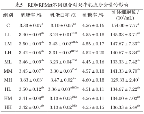 2.3 RE和RPMet不同组合对奶牛乳成分的影响(见表5)