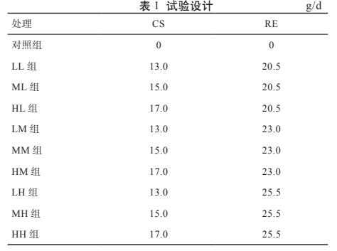 CS 购自青岛润博特生物科技有限公司,组成为半胱胺盐酸盐、棕桐油、淀粉等,含量为 40%,过瘤胃率为 50%。RE 购自徐州英美尔生物科技有限公司,成分含量为有机稀土(ReC6O7H8·3H2O)≥ 36%,其中铅(Pb)≤ 0.002%、砷(As)≤ 0.005%。