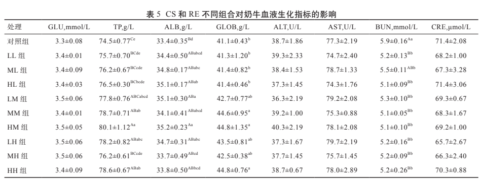 3.3 CS 和 RE 不同组合对奶牛血液生化指标的影响