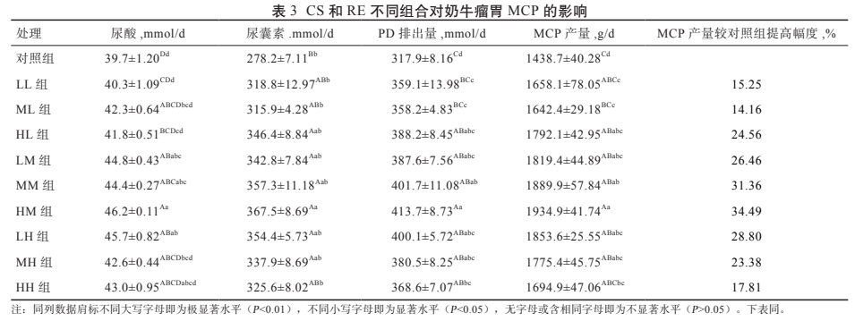 3.1 CS 和 RE 不同组合对奶牛瘤胃 MCP 的影响