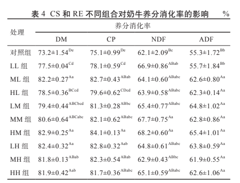 3.2 CS 和 RE 不同组合对奶牛养分消化率的影响