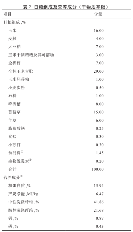 注:①预混料为每千克 TMR 提供:维生素 A 8 000 IU,维生素 D3 1 600 IU,维生素 E 30 mg,铁 20 mg,铜 16 mg,锌 100 mg,锰 35 mg,碘 1 mg,硒 0.5 mg,钴 0.5 mg。②生物脱霉素中含:甘露寡糖≥ 14%,β- 葡聚糖 15%~40%,粗蛋白质≤ 35%,水分≤ 6%。③产奶净能:将每个原料的产奶净能 [7] 与其所占的百分比相乘后相加。其余营养成分为实测值。